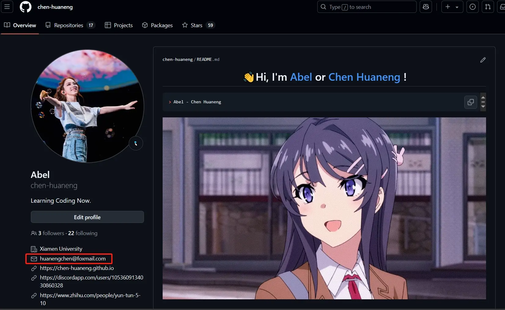 有时候会遇到这样的情况,当你找到一个很不错的项目的时候,想和开发者交流一些相关的问题。于是你找到该用户的主页,一般情况下,开发者会在 GitHub 主页留下自己的联系邮箱,如下图所示,这是我的 GitHub 个人主页:
