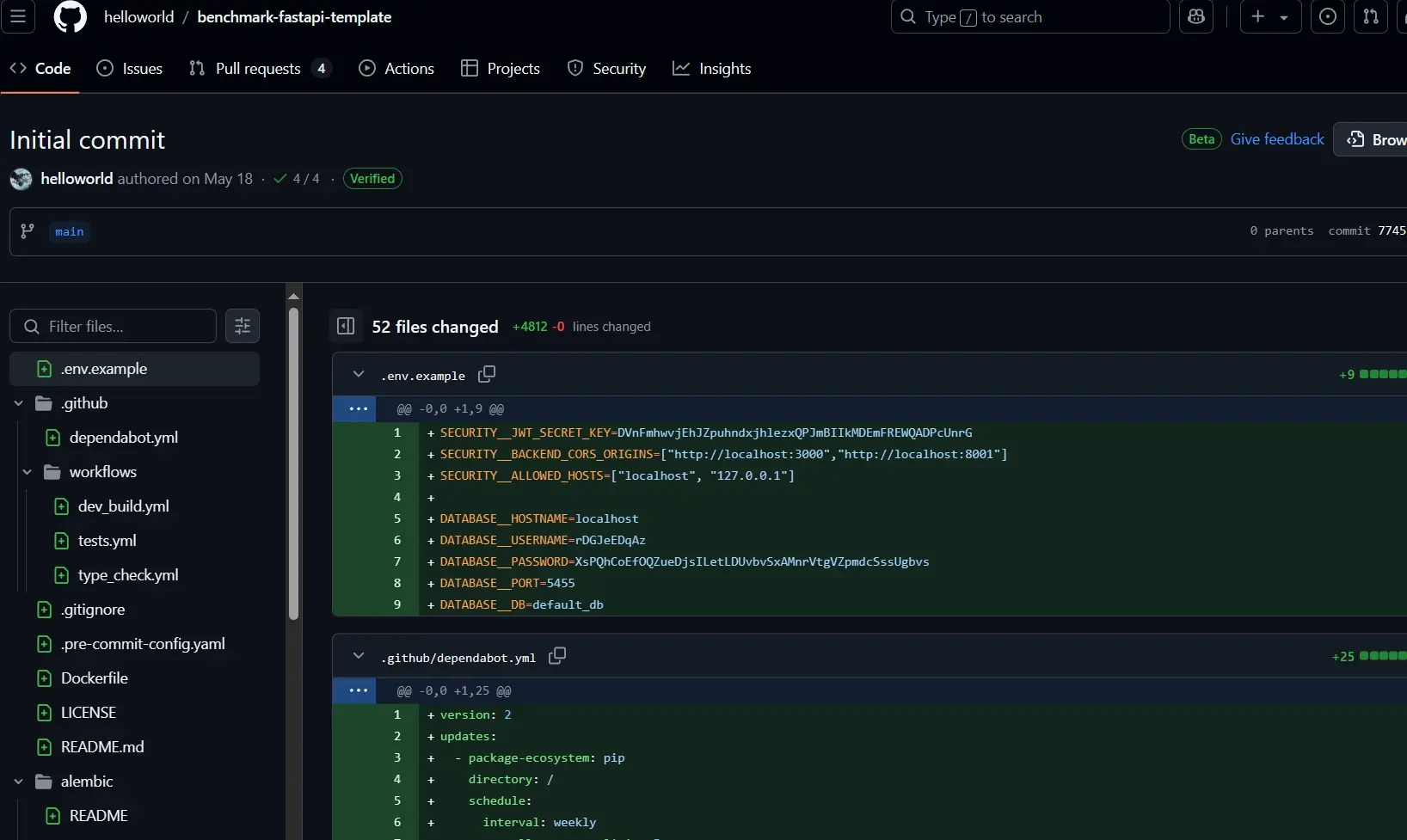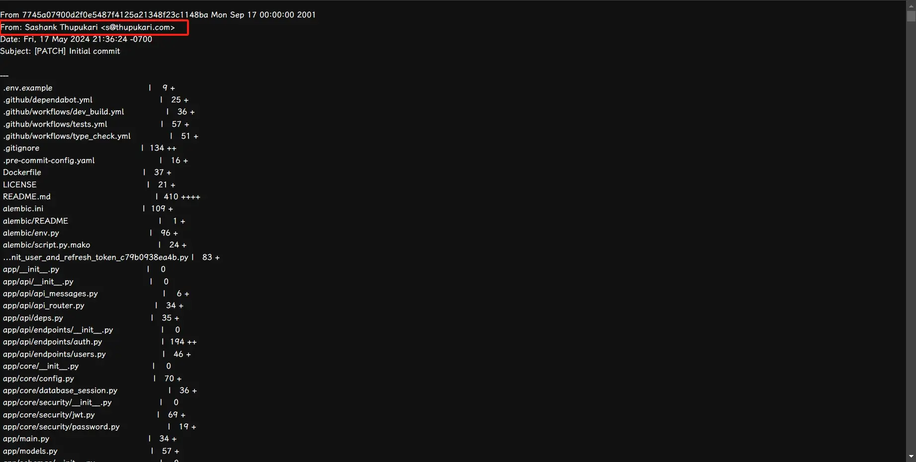 这个Commit对应的链接是 https://github.com/helloworld/benchmark-fastapi-template/commit/7745a07900d2f0e5487f4125a21348f23c1148ba ,现在只需要在这个链接的末尾加上 .patch ,变成 https://github.com/helloworld/benchmark-fastapi-template/commit/7745a07900d2f0e5487f4125a21348f23c1148ba.patch 就可以看到纯文本形式的Commit记录。而开发者的邮箱就在上面。