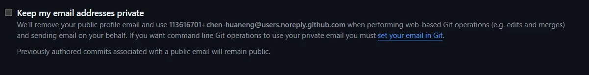 Git中设置git config --global user.email "username@users.noreply.github.com",如果在设置之前提交了还要记得重置上次提交的作者信息git commit --amend --reset-authorc,否则远程仓库会拒绝提交[2]。