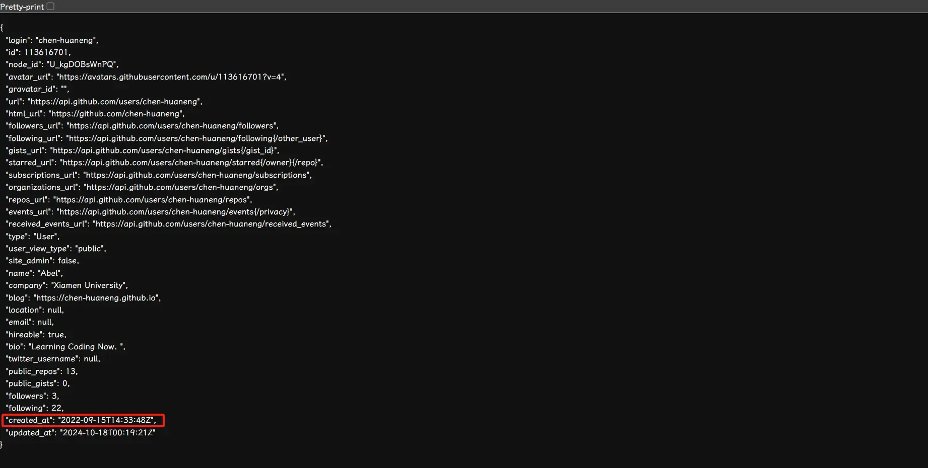 https://api.github.com/users/{your-username},将{your-username}替换成GitHub用户名。 - 按下回车键后,会得到一个JSON格式的返回结果。