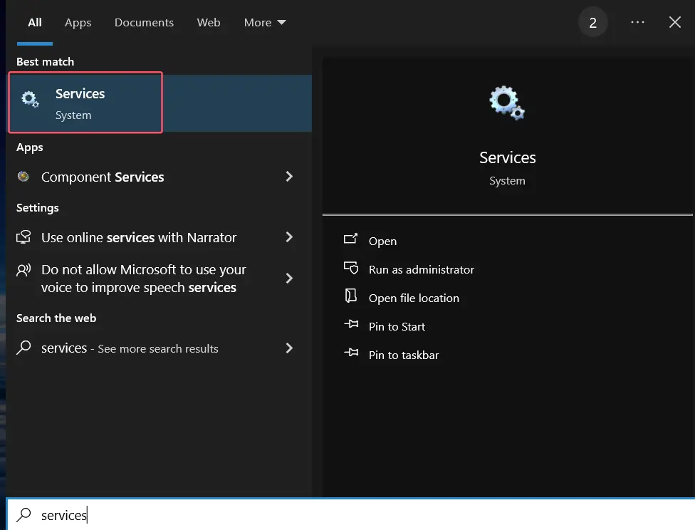 按下 Win 徽标键,直接键入 services 或者 服务 打开第一个: