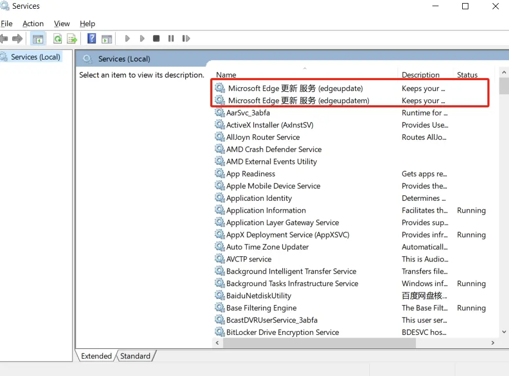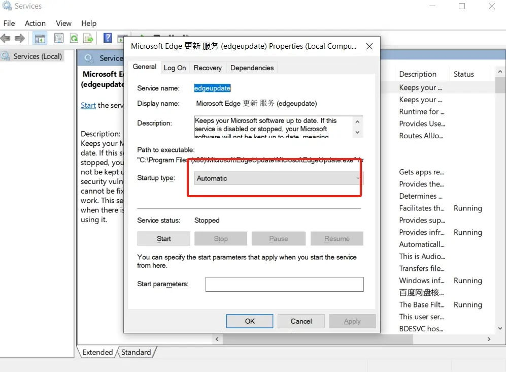 找到跟 Microsoft Edge 更新有关的两个选项,右键选择属性,将启动类型改为自动,重新更新 Edge 即可: