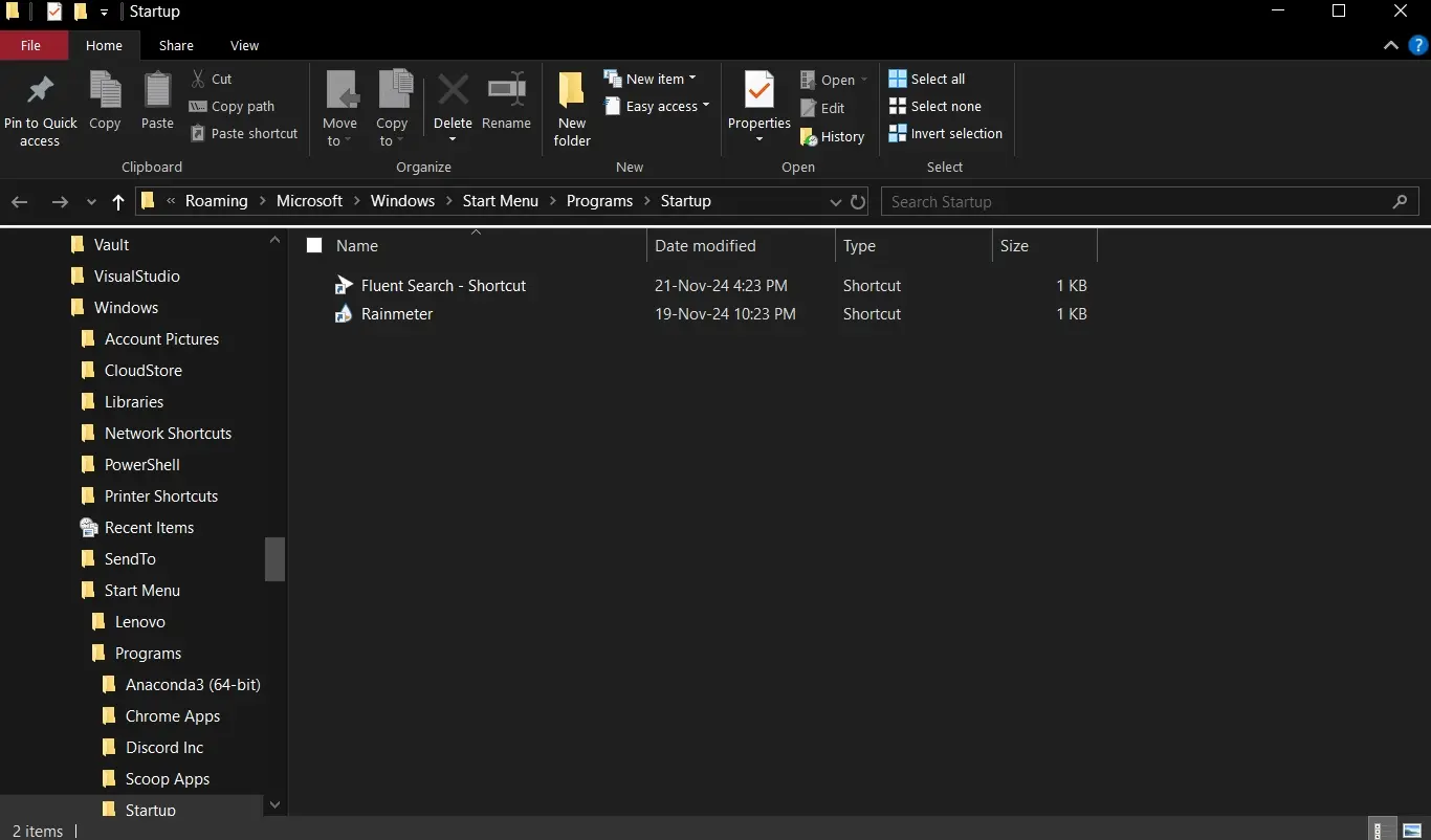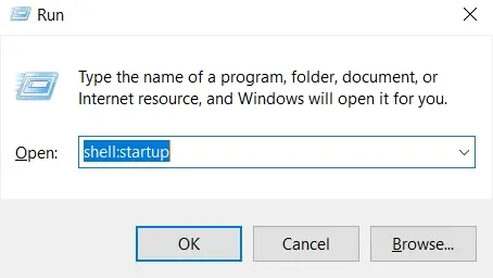 在运行输入框中输入 shell:startup 命令后点击确定。打开系统启动项目文件夹。