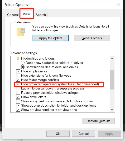 在查看菜单最右边有一个选项,单击打开“文件夹选项”,选中“查看”一栏,在高级设置里取消勾选“隐藏受操作系统保护的文件”,应用后就能看到自己的用户文件夹,最后选择确定。