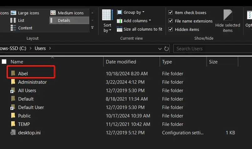 一般来说,在 C:\Users 这个路径下应该有一个当前用户的文件夹,比如在下面的图中应该有一个 Abel 的文件夹,并且查看选项中已经勾选了显示隐藏文件这一个选项: