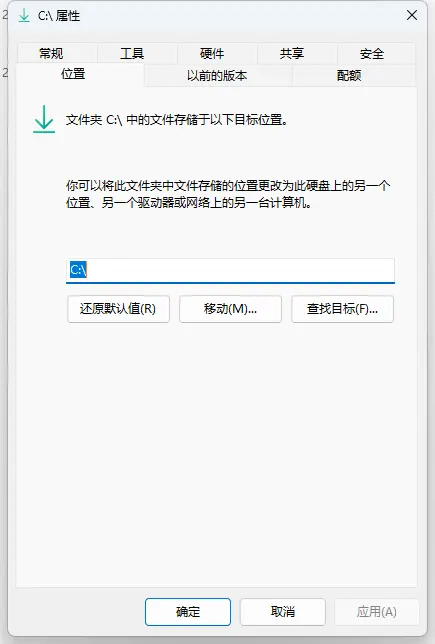 我们本身已经将下载位置移动到C盘根路径了,再次右键打开的属性已经是C盘磁盘分区的属性了,修改磁盘分区的路径本身就是一种错误的操作,解决思路是通过修改注册表直接修改下载的文件存储位置。