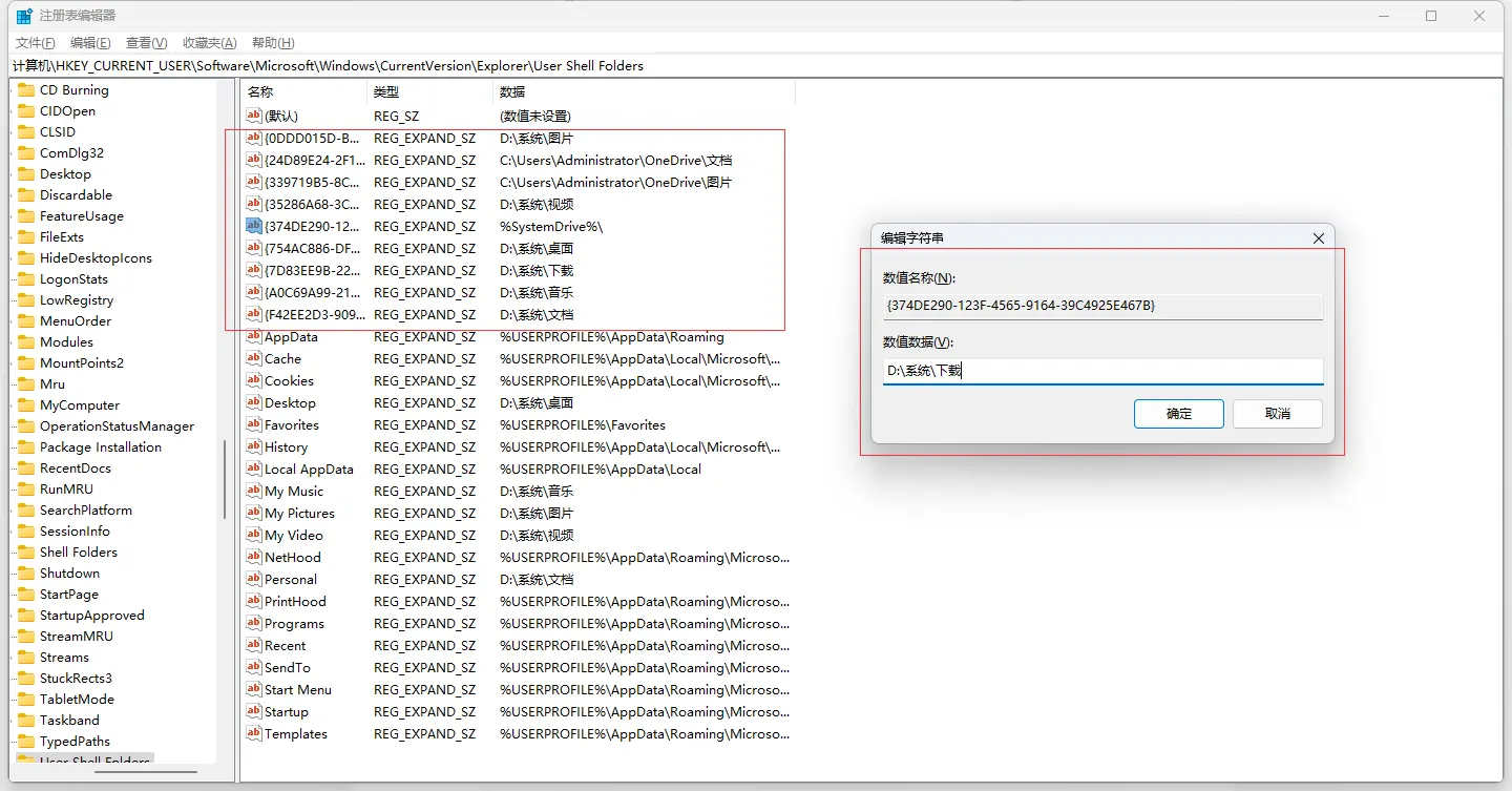 计算机\HKEY_CURRENT_USER\SOFTWARE\Microsoft\Windows\CurrentVersion\Explorer\User Shell Folders,直接将路径复制上去打开也可以。 - 找到下载对应的ID串需要修改的项,修改对应值为你要设置的路径位置。