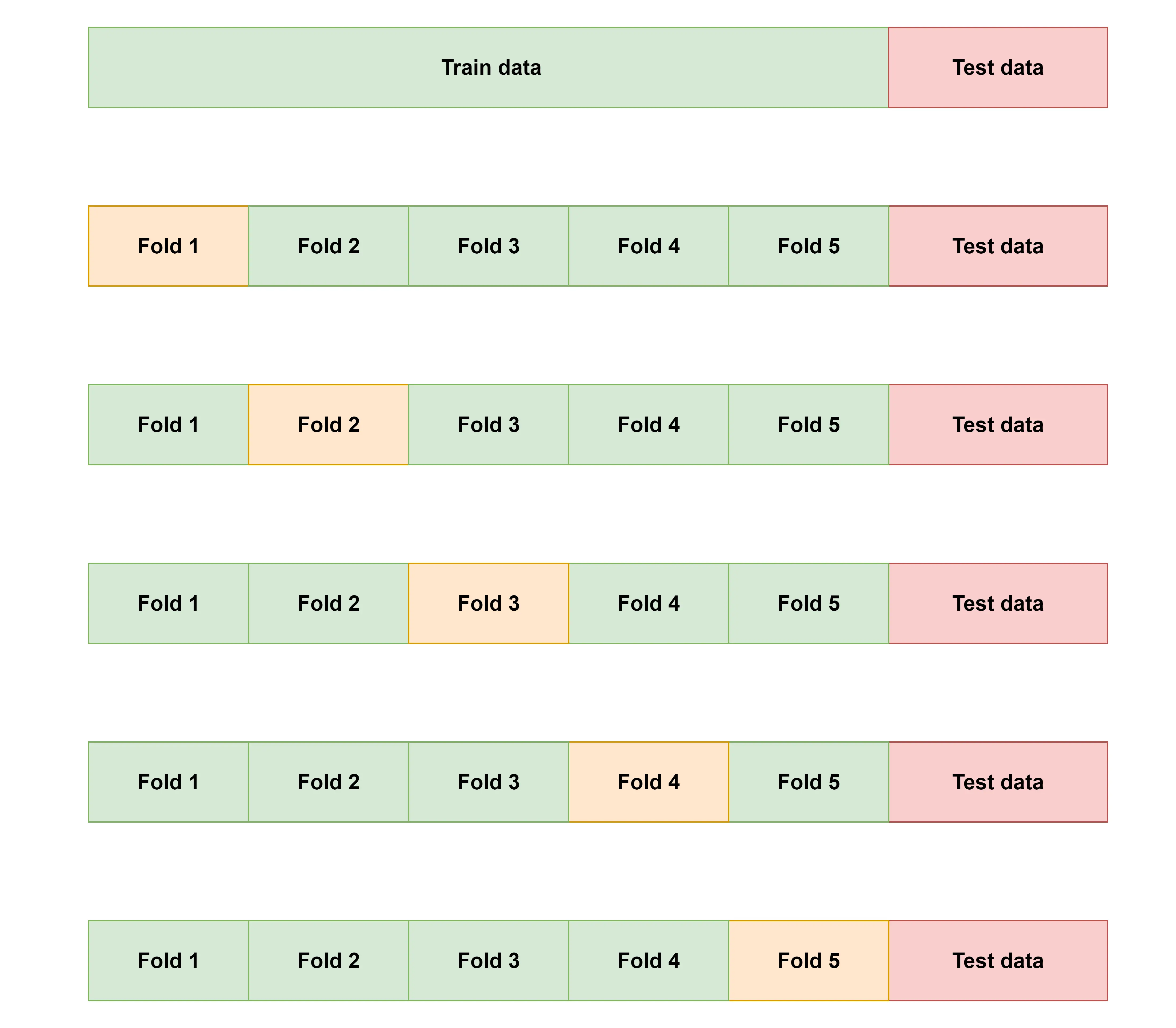 图最上面的部分表示我们拥有的数据,而后我们对数据进行了再次分割,主要是对训练集,假设将训练集分成5份(该数目被称为折数,5-fold交叉验证),每次都用其中4份来训练模型,黄色的那份用来验证4份训练出来的模型的准确率,记下准确率。然后再次在这5份中取另外4份做训练集,1份做验证集,再次得到一个模型的准确率,一共做五次(每个fold都做一次验证集)。直到所有5份都做过1次验证集,也即验证集名额循环了一圈,交叉验证的过程就结束。算得这5次准确率的均值,留下准确率最高的模型,即确定该模型的超参数,也即确定了最终模型的超参数。
