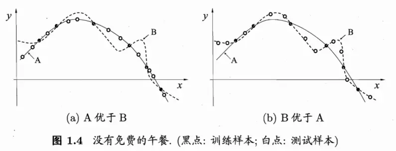 事实上,没有完美的归纳偏好可以使得一个模型适用于所有的情况,换句话说,对于一个学习算法 \(\mathfrak{L_a}\) 而言,若它在某些问题上比学习算法 \(\mathfrak{L_b}\) 好,则必存在另一些问题,在那里 \(\mathfrak{L_b}\) 比 \(\mathfrak{L_a}\) 好。这个结论对任何算法均成立。也叫“没有免费的午餐”定理(No Free Lunch Theorem,简称 NFL 定理):无论学习算法 \(\mathfrak{L_a}\) 多聪明、学习算法 \(\mathfrak{L_b}\) 多笨拙,它们的期望性能是一样的。