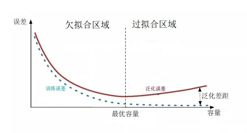 训练刚开始的时候,模型还在学习过程中,处于欠拟合区域。随着训练的进行,训练误差和泛化误差都下降。在到达一个临界点之后,训练集的误差下降,测试集的误差上升了,这个时候就进入了过拟合区域——由于训练出来的模型过度拟合了训练集,对训练集以外的数据却不能准确预测。