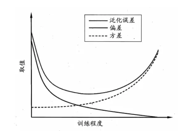 一般来说,偏差与方差是有冲突的,这称为偏差-方差窘境(bias-variance dilemma)。给定学习任务,假定我们能控制学习算法的训练程度,则在训练不足时,学习器的拟合能力不够强,训练数据的扰动不足以使学习器产生显著变化,此时偏差主导了泛化错误率;随着训练程度的加深,学习器的拟合能力逐渐增强,训练数据发生的扰动渐渐能被学习器学到,方差逐渐主导了泛化错误率;在训练程度充足后,学习器的拟合能力已经非常强,训练数据发生的轻微扰动都会导致学习器发生显著变化,若训练数据自身的、非全局的特性被学习器学到了,则将发生过拟合。