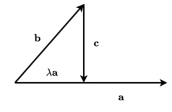 对于向量形式,还可以取: \[ \begin{align*} \lambda &= \frac{\mathbf{a}^{\mathsf{T}}\cdot\mathbf{b}}{\Vert\mathbf{a}\Vert^2} \\ \mathbf{c} &= \mathbf{b} - \lambda \mathbf{a} \\ &= \mathbf{b} - \frac{\mathbf{a}^{\mathsf{T}}\cdot\mathbf{b}}{\Vert\mathbf{a}\Vert^2} \mathbf{a} \end{align*} \] 带回公式 \(\eqref{eq:vector}\) 得到: \[ \begin{equation} 0 \leq \Vert\mathbf{c}\Vert^2 = \left(\frac{\mathbf{a}^{\mathsf{T}}\cdot\mathbf{b}}{\Vert\mathbf{a}\Vert^2}\right)^2 \Vert\mathbf{a}\Vert^2 - \left(\frac{\mathbf{a}^{\mathsf{T}}\cdot\mathbf{b}}{\Vert\mathbf{a}\Vert^2}\right)\cdot 2\mathbf{a}^{\mathsf{T}} \cdot \mathbf{b} + \Vert\mathbf{b}\Vert^2\label{eq:vector2} \end{equation} \] 整理得: \[ \begin{align*} \left(\mathbf{a}^\mathsf{T} \cdot \mathbf{b}\right)^2 \leq \Vert\mathbf{a}\Vert^2\Vert\mathbf{b}\Vert^2 \\ \Rightarrow \vert\mathbf{a}^\mathsf{T} \cdot \mathbf{b}\vert \leq \Vert\mathbf{a}\Vert\Vert\mathbf{b}\Vert \end{align*} \] 至于 \(\lambda\) 为什么如此取值,首先看向量 \(\mathbf{a}\) 和 \(\mathbf{c}\) 之间的关系: \[ \mathbf{a}^\mathsf{T} \cdot \mathbf{c} = \mathbf{a}^\mathsf{T} \cdot (\mathbf{b} - \lambda \mathbf{a}) = \mathbf{a}^\mathsf{T} \cdot \mathbf{b} - \lambda\Vert\mathbf{a}\Vert^2 \] 因此有: \[ \mathbf{a}^\mathsf{T} \cdot \mathbf{c} = 0 \Leftrightarrow \mathbf{a} \perp \mathbf{c} \Leftrightarrow \lambda = \frac{\mathbf{a}^{\mathsf{T}}\cdot\mathbf{b}}{\Vert\mathbf{a}\Vert^2} \] 换句话说,\(\lambda\) 取 \(\frac{\mathbf{a}^{\mathsf{T}}\cdot\mathbf{b}}{\Vert\mathbf{a}\Vert^2}\) 是有几何意义的,并非无中生有靠灵感而得来。此时 \(\lambda \mathbf{a}\) 正是向量 \(\mathbf{b}\) 在 \(\mathbf{a}\) 上的投影,而 \(\Vert\mathbf{c}\Vert\) 则是 \(\mathbf{b}\) 到 \(\mathbf{a}\) 的最短距离。\(\lambda\) 还有一个很出名的解释就是 Lagrange 乘子(Lagrange multiplier):为求 \(\mathbf{b}\) 到 \(\mathbf{a}\) 的最短距离我们必须调整 \(\lambda\) 使得 \(\mathbf{a} \perp (\mathbf{b} - \lambda \mathbf{a})\),如果是函数则该条件换为微分或梯度(gradient)等于零。