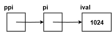 声明符号的理解方式是从右到左的,即声明符号修饰的是它右边的变量名。比如指向指针的指针(pointers to pointers)是指一个指针变量存储了另一个指针的地址。如上图所示,pi 是指向整数的指针,而 ppi 是指向指针的指针。